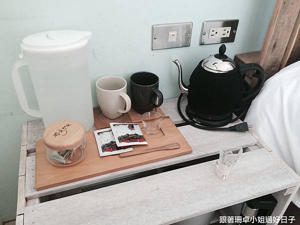 床頭備有茶、電熱水壺、點心跟小夜燈