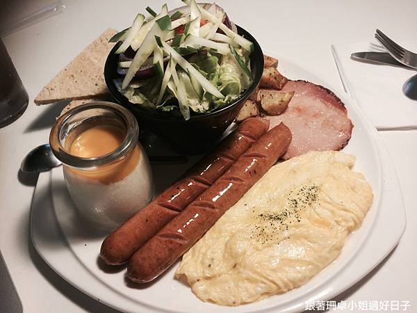 另外還有義式香料炒薯塊、德式燻肉雙腸、法式牛奶炒蛋(有機蛋)、本日鮮蔬沙拉跟手工優格果昔