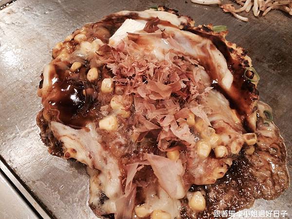 下面是粉漿凝固成的餅,上面搭配起司、玉米跟柴魚片