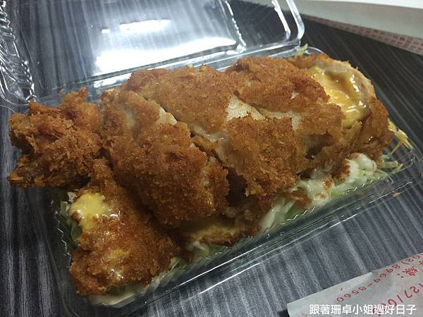 上面放著爆漿的雞排,下面搭配爽口的高麗菜絲跟塔塔醬