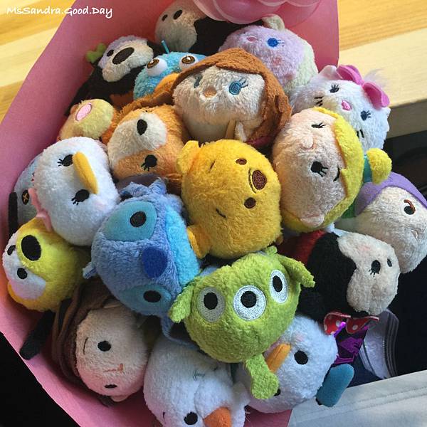 直到順著小朋友手指的方向看過去,我才看到珊迪先生捧著他自己手工做的tsum tsum花束