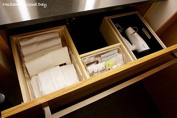 洗手檯下方的抽屜打開有許多備品