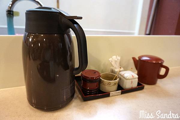 桌上有茶、可以自己加的淋飯醬料、七味粉、抹茶鹽等配料
