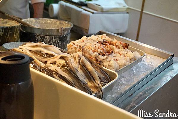 師傅旁邊放著的就是像小山一樣的新鮮食材:穴子跟大隻的蝦子~
