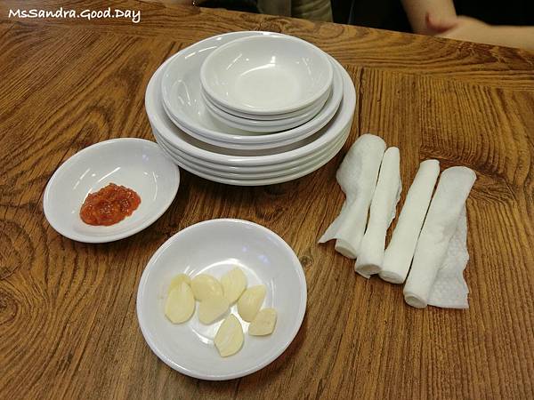 阿珠媽(韓國的阿姨的意思)會送上餐具、擦手巾以及辣椒大蒜這些佐料