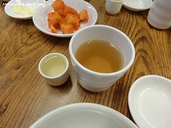點完餐之後店家會送上一杯小小杯的蔘酒(左邊那杯)
