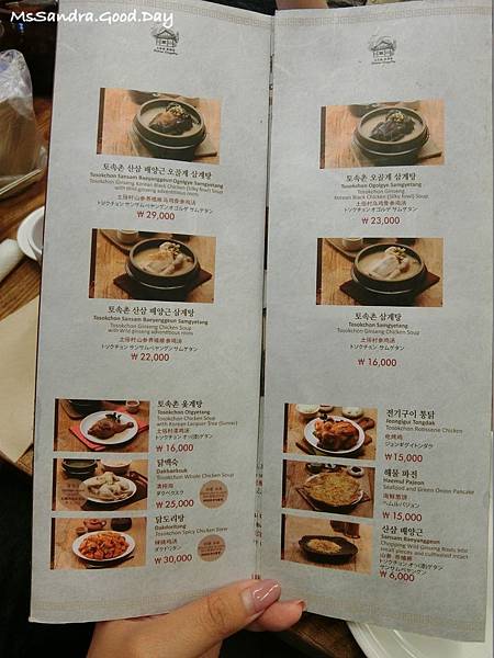 蔘雞湯₩16,000、烏骨雞湯₩23,000、加上山蔘培養根的蔘雞湯₩22,000或烏骨雞湯₩29,000