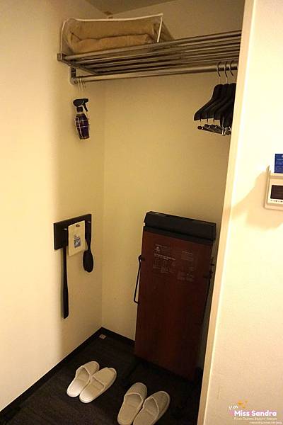 另外在門邊也有小小的吊衣空間,貼心的除臭噴霧、鞋拔、刷子都有