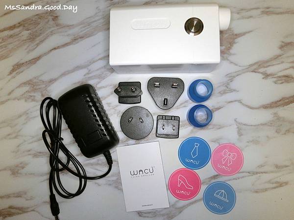 有一台真空壓縮機、電源及變壓器、四種不同的萬國插頭可以替換、兩個真空吸嘴以及可以進行不同標示的超可愛貼紙~