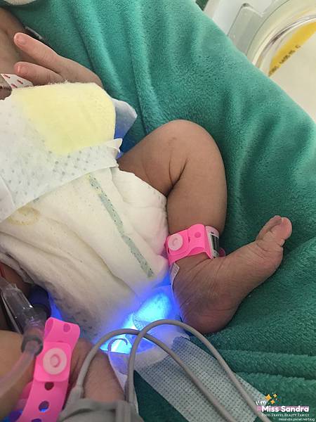 所以她出生之後還是住在保溫箱一段時間,在特別觀察區,而且上了點滴,後來又因為黃疸而需要照光