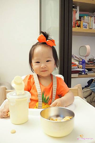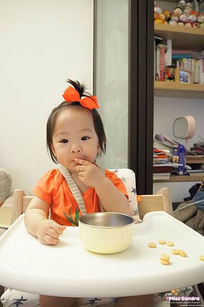 有時候也會把水果切好或圈圈米餅放進碗裡讓她自己拿著吃