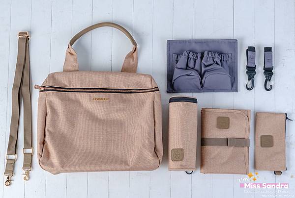 照片裡的這些全部都是這款包包標配的配件,由左至右共有一條背帶、超美的包包本身、可拆式內裡夾層、推車掛勾2個、保溫水壺套、尿布墊、小物收納包