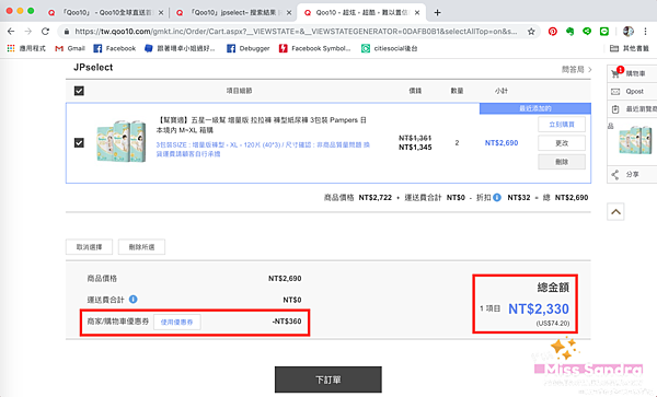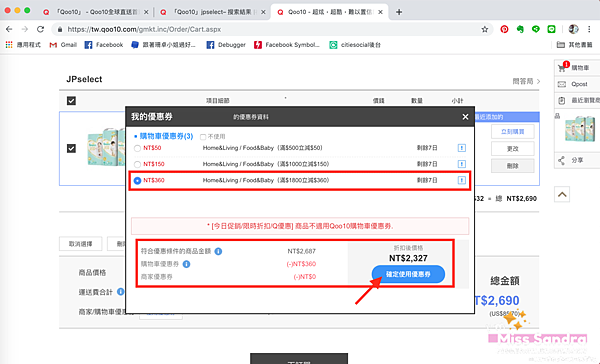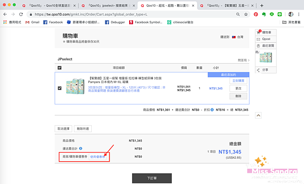 放入購物車之後,上面顯示的還是沒有使用折價券的金額,所以不用擔心~