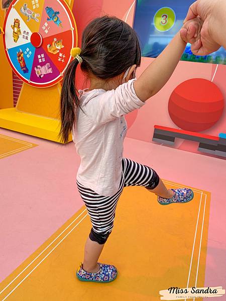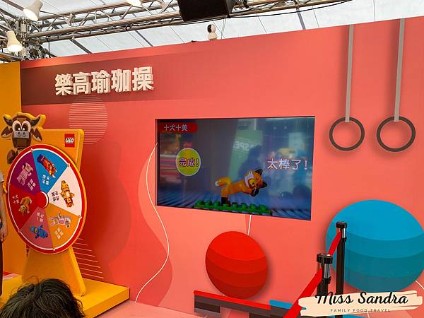 第二關樂高瑜伽操是先讓小朋友到轉盤那邊轉出一個動物,接著螢幕上會出現那個動物的影片及指定動作