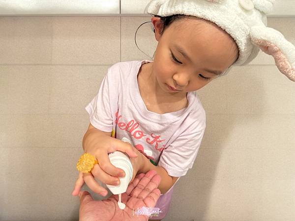 艾瑪目前6歲,力氣已經可以自己按壓得立妥潤膚乳的壓頭了,所以洗完澡的時候我也會讓她幫忙一起擦乳液