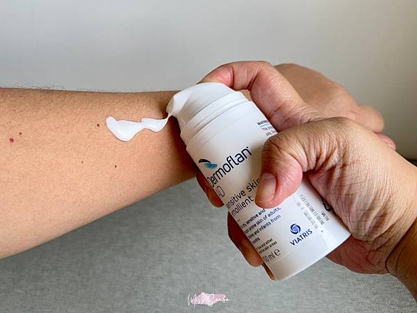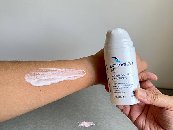 一般比較強調保濕型的乳液都會比較厚重,但Dermoflan AD 得立妥潤膚乳很好推開,而且擦完一下就吸收,不會有黏黏的感覺。