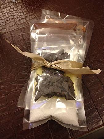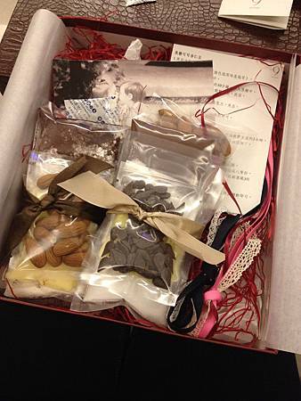 禮盒的內容包括了可可雪球餅乾及焦糖巧克力杏仁豆兩包材料、緞帶、透明的包裝袋、小卡片等